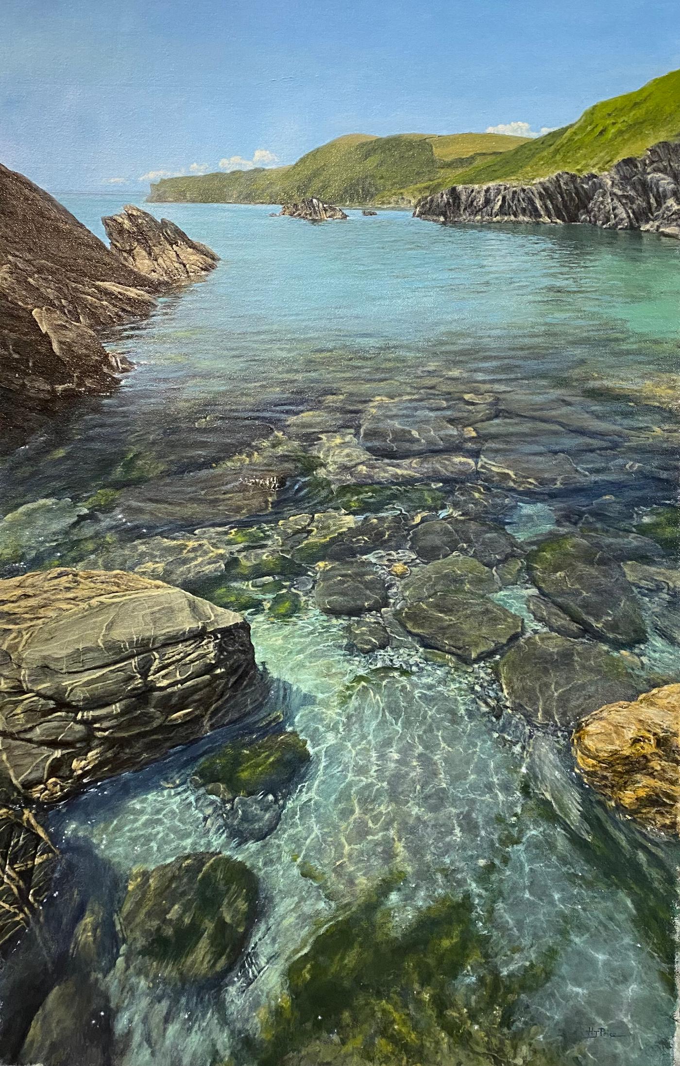 Attracted by the clear water and beautiful pebbles in this quiet cove, I was compelled to create a larger scale painting to give the viewer the sense of tranquility that you get from this place.