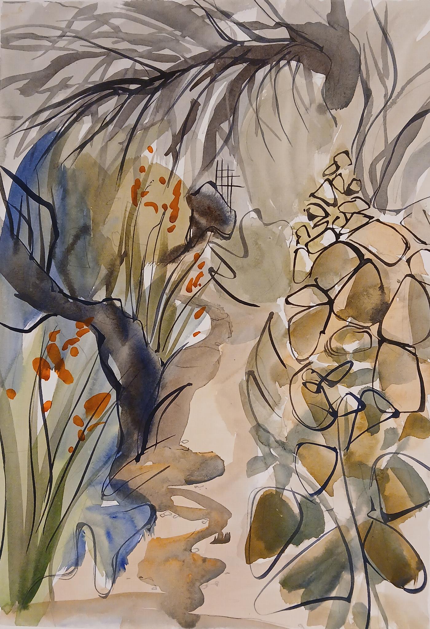 A late summer dusty pathway with it's rambling flowers, overhanging trees and crumbling stone wall.
