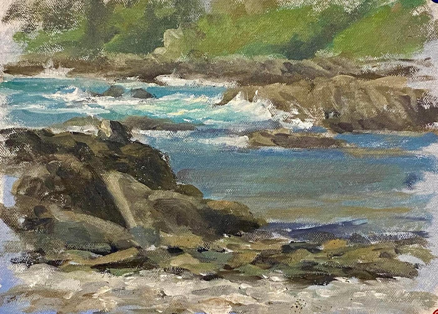 Such a beautiful morning light in early September,it really brought out the colours. The headland is changing with more siennas in amongst the greens, and the sea had an array of blues and purples. The lively surf was creating the most beautiful minty green and the rocks had subtle shades of greens, blues, purples and ochres. So much to try and record.