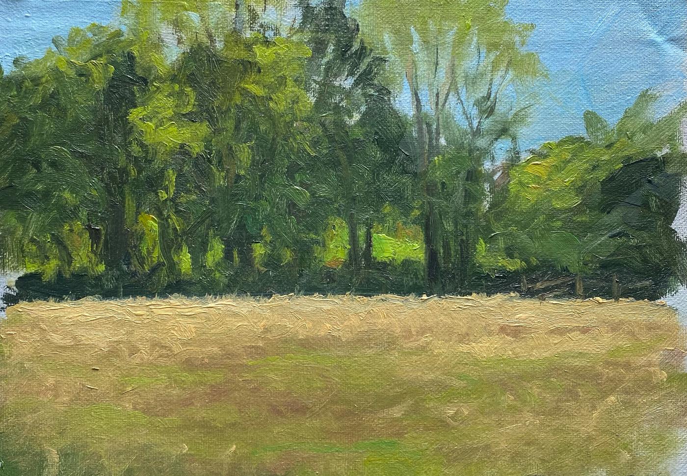 A quick sketch trying to capture the subtle greens of the trees against the warm Summer grasses.