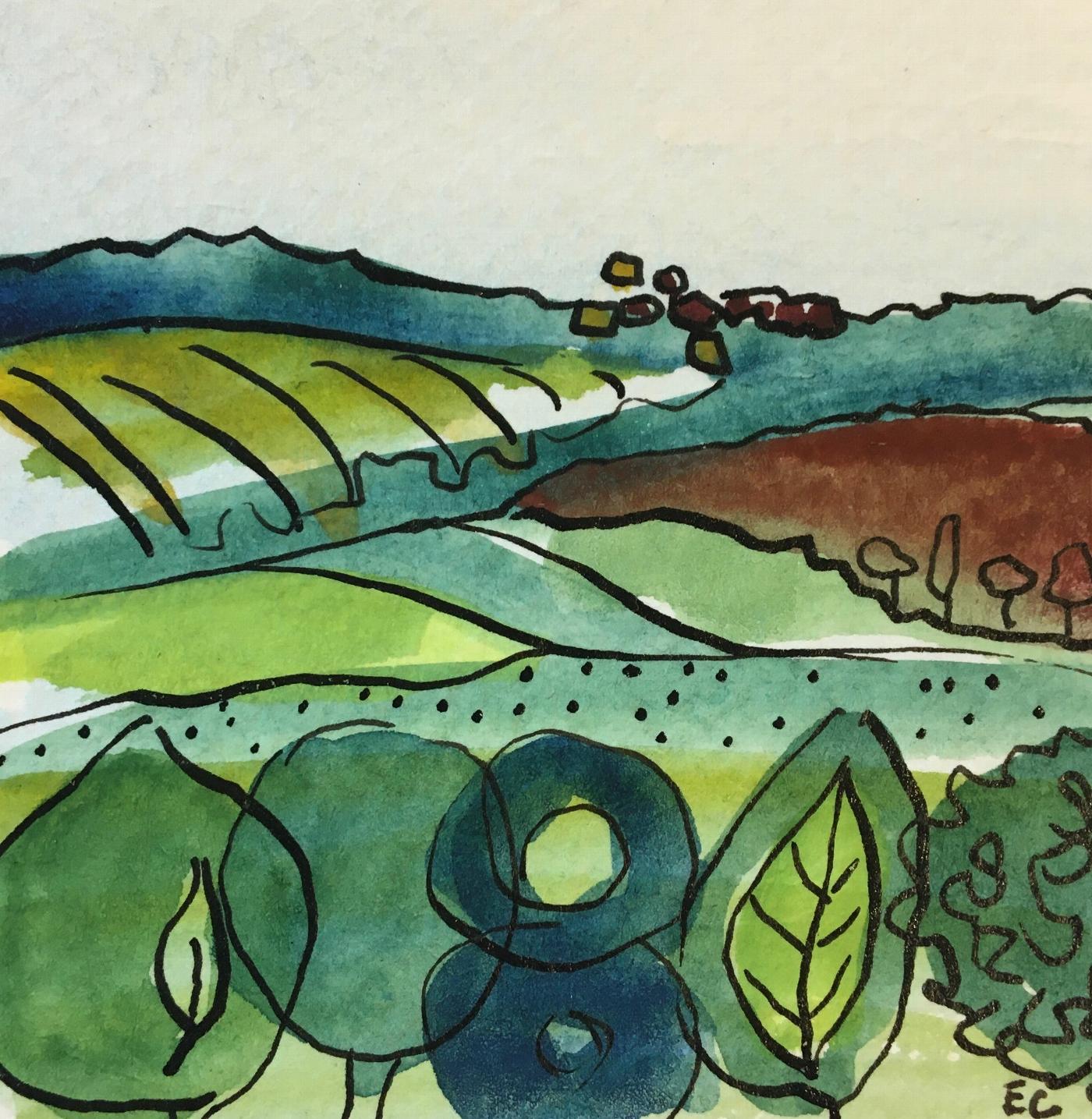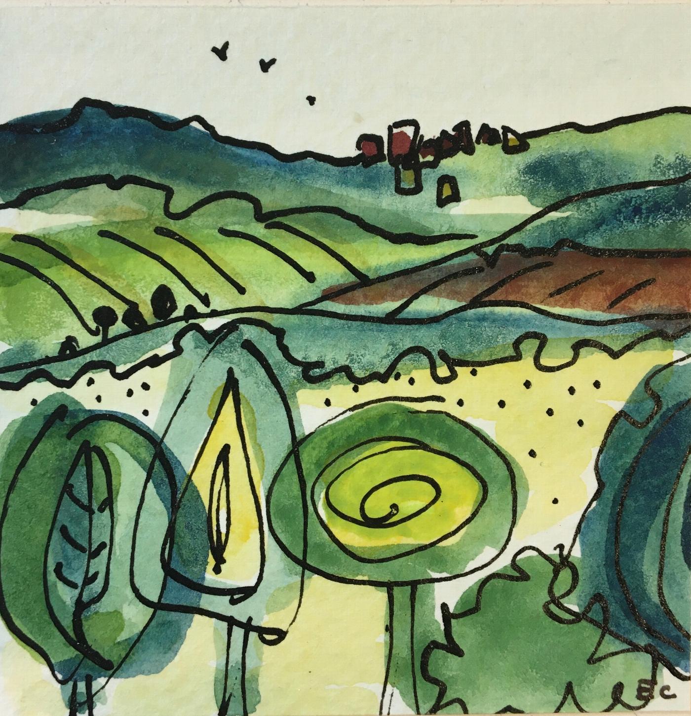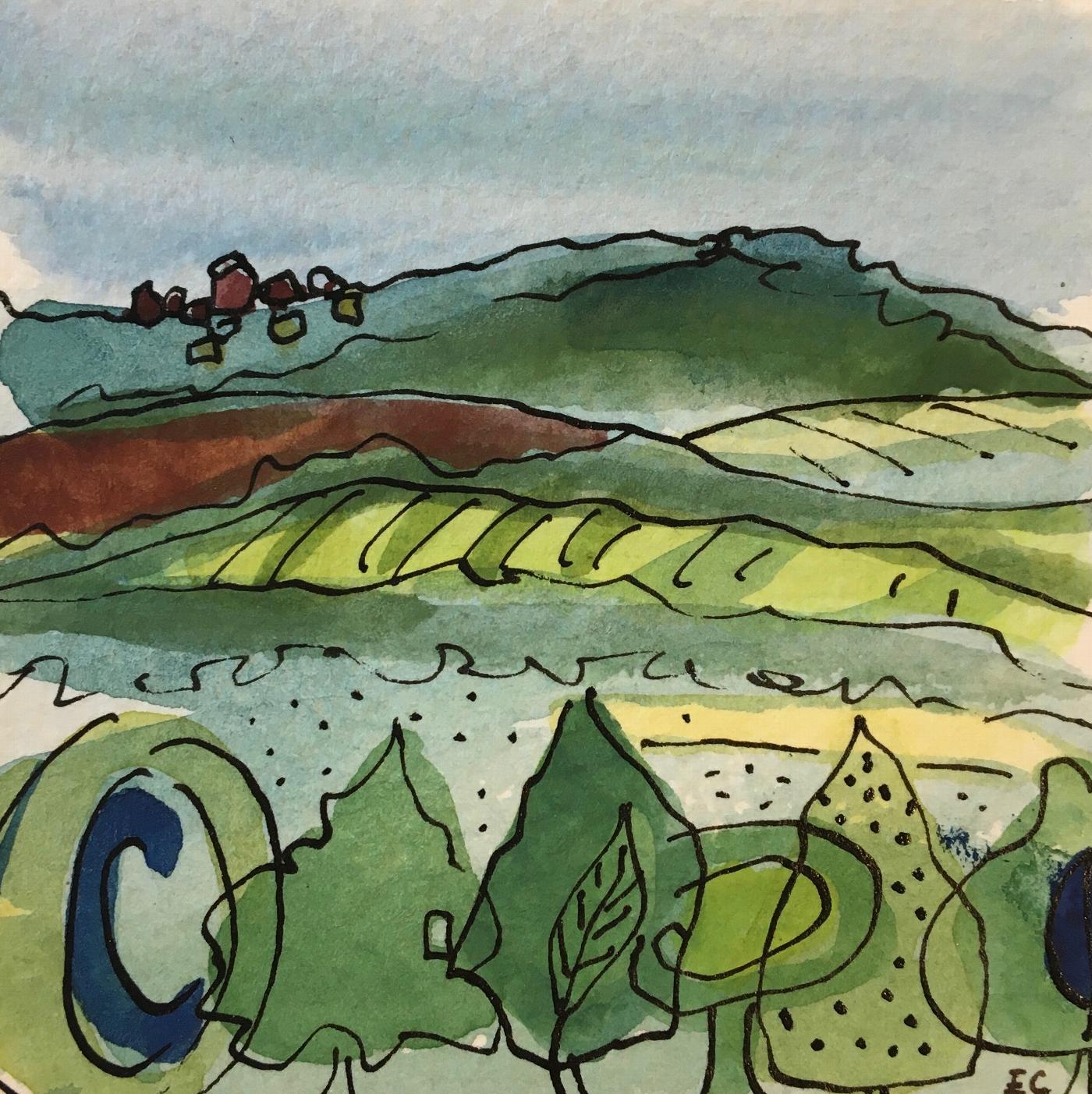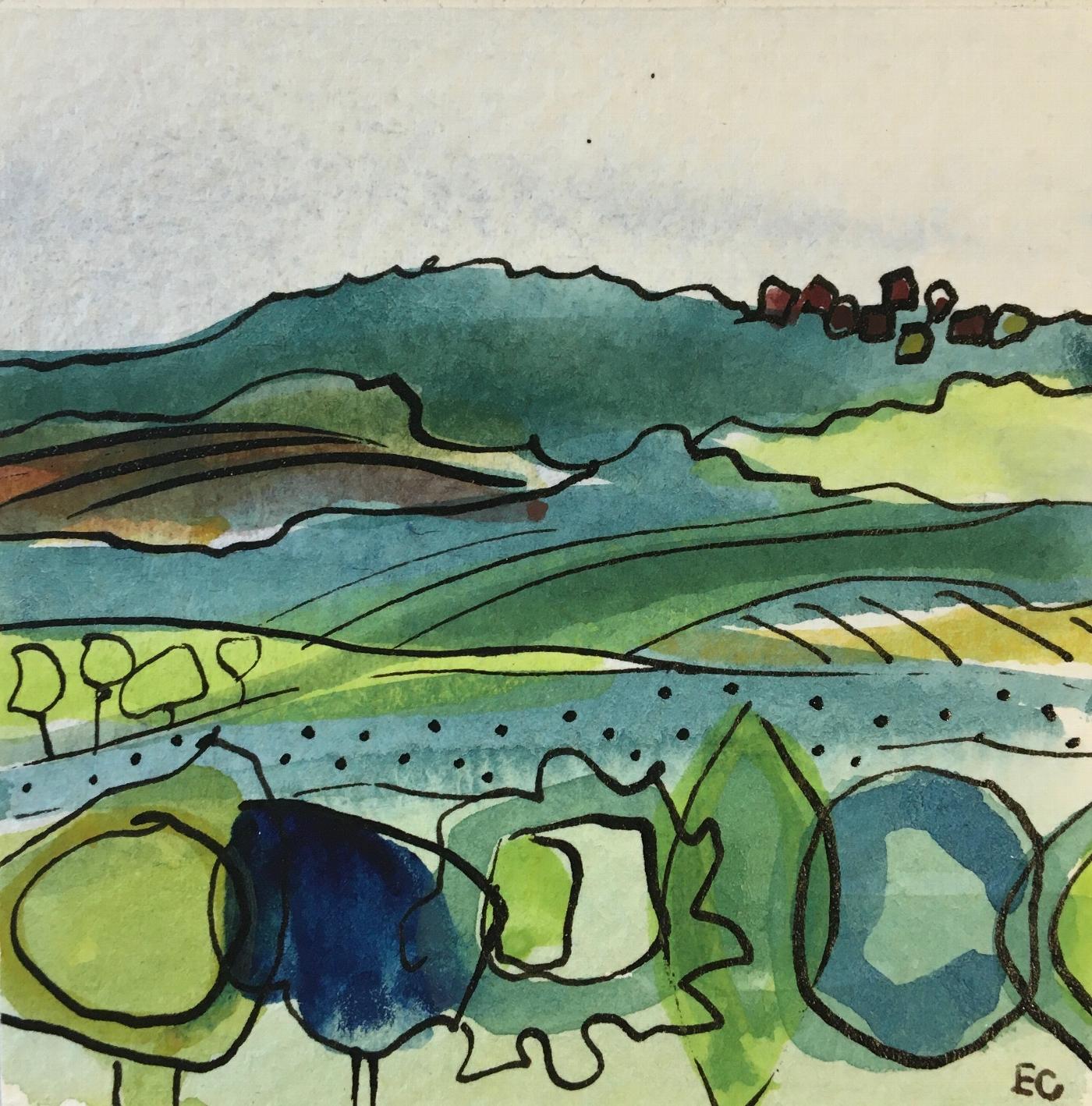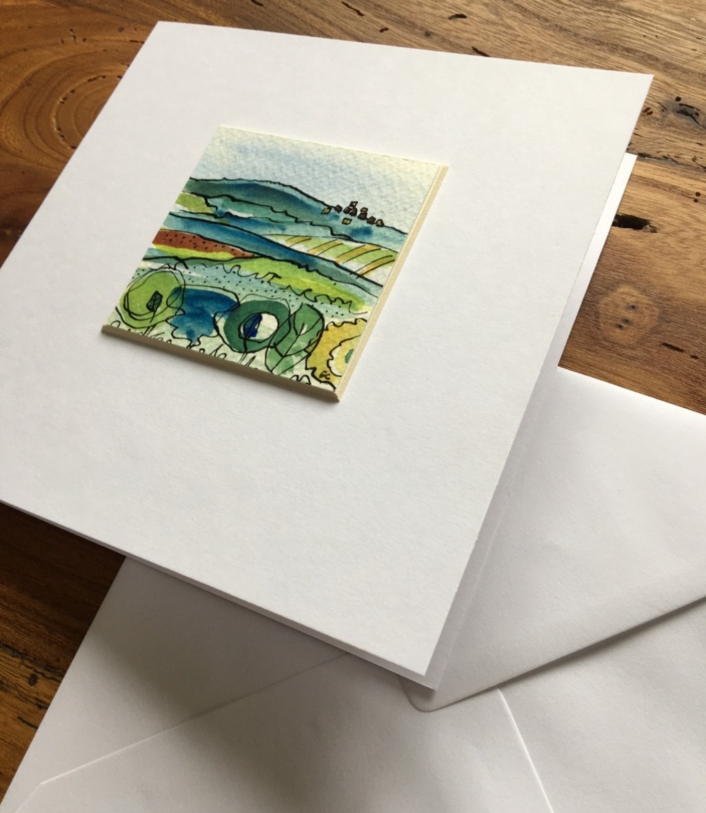 A patternistic landscape painting using watercolour and pen. Each card is slightly different due to being handpainted but you can choose which one you prefer!